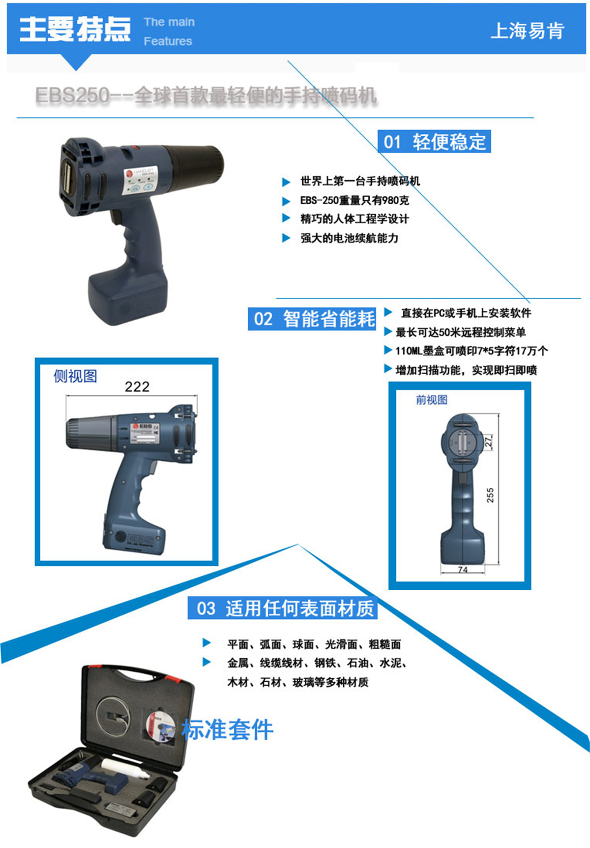 EBS經典手持噴碼,上市超過15年,深受全球用戶喜愛和認可。采用德國EBS核心的噴頭技術,噴頭結構精密小巧、不堵噴頭,穩定耐用。