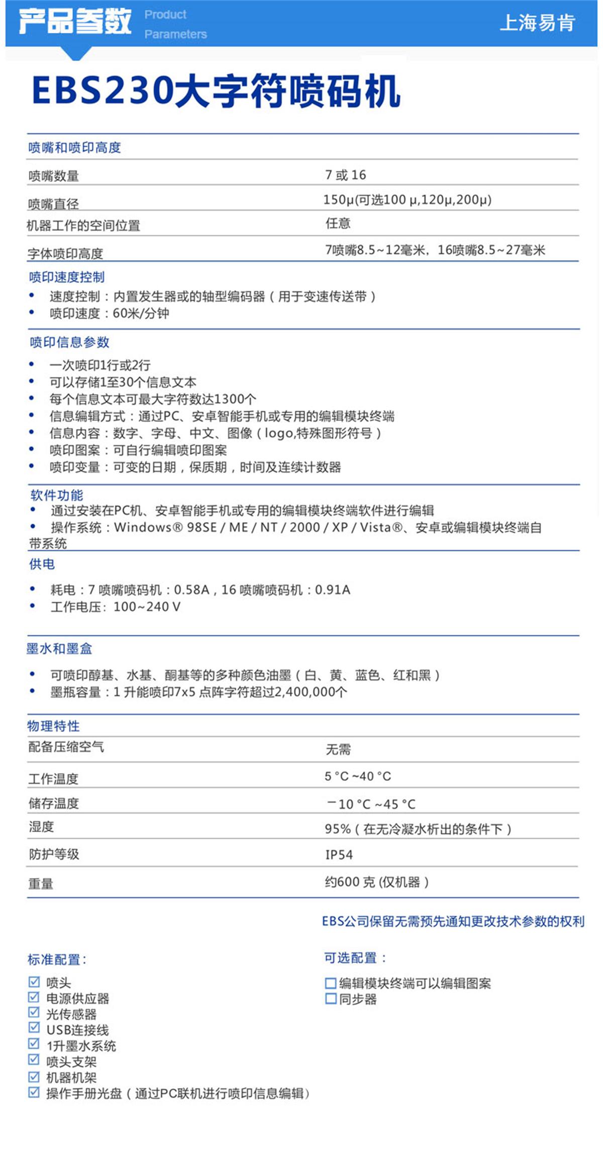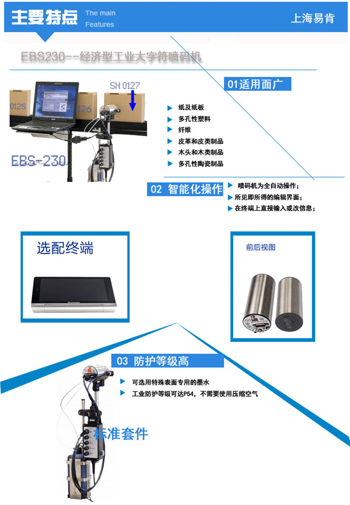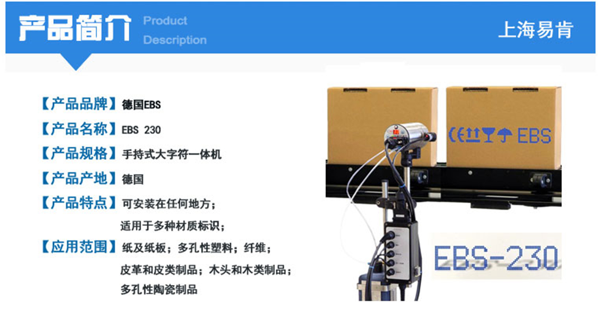 230是一款經濟且操作簡便的工業大字符噴碼機,EBS-230體積非常小,卻功能齊全,可以滿足對采購成本和操作要求高,卻又需要精密功能的用戶。